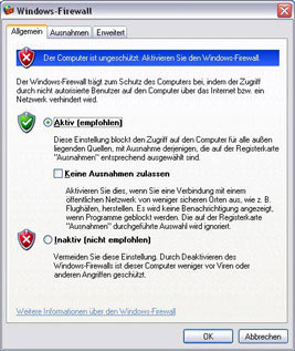 Horch was kommt von draußen rein, wird doch wohl kein Fremder sein… – und wenn doch kommt jetzt die integrierte Firewall bzw. der Virusscanner vom Sicherheitscenter zum Einsatz. Das Sicherheitscenter stellt das zentrale Programm dar, indem alle neuen Sicherheitsfeatures gesteuert werden können. Hier können selbst relativ unerfahrene Benutzer einfach ihren Computer vor Eindringlingen schützen. Nach der Service Pack 2 Installation startet das Sicherheitscenter gleich nach dem Neustart und so lässt es sich schnell und einfach konfigurieren. Im normalen Betrieb läuft es "lautlos" im Hintergrund und kann für Schaulustige auf Wunsch auch Alarmmeldungen anzeigen. Weiterhin ist für den interessierten User möglich Sicherheits- und Vireninformationen von Microsoft zu ordern oder Unterstützung bei Sicherheitsproblemen zu erhalten. Die automatische Update Funktion hält das System zudem auf dem neusten (Microsoft-) Sicherheitsstand mit Hilfe von Windows Update Version 5. Auch bei Virenprogrammen, welche von anderen Herstellern stammen, wird durch eine API Schnittstelle geprüft, wie alt beispielsweise die Virendefinitionen sind. Für den Laien ist es also sehr einfach durch das Sicherheitscenter geworden, seinen PC zu schützen und einen Überblick über den Schutz zu erhalten. Für den Profi ist es vorteilhaft, dass sich im "Falle des Falles" alles schnell deaktivieren lässt. ;-)